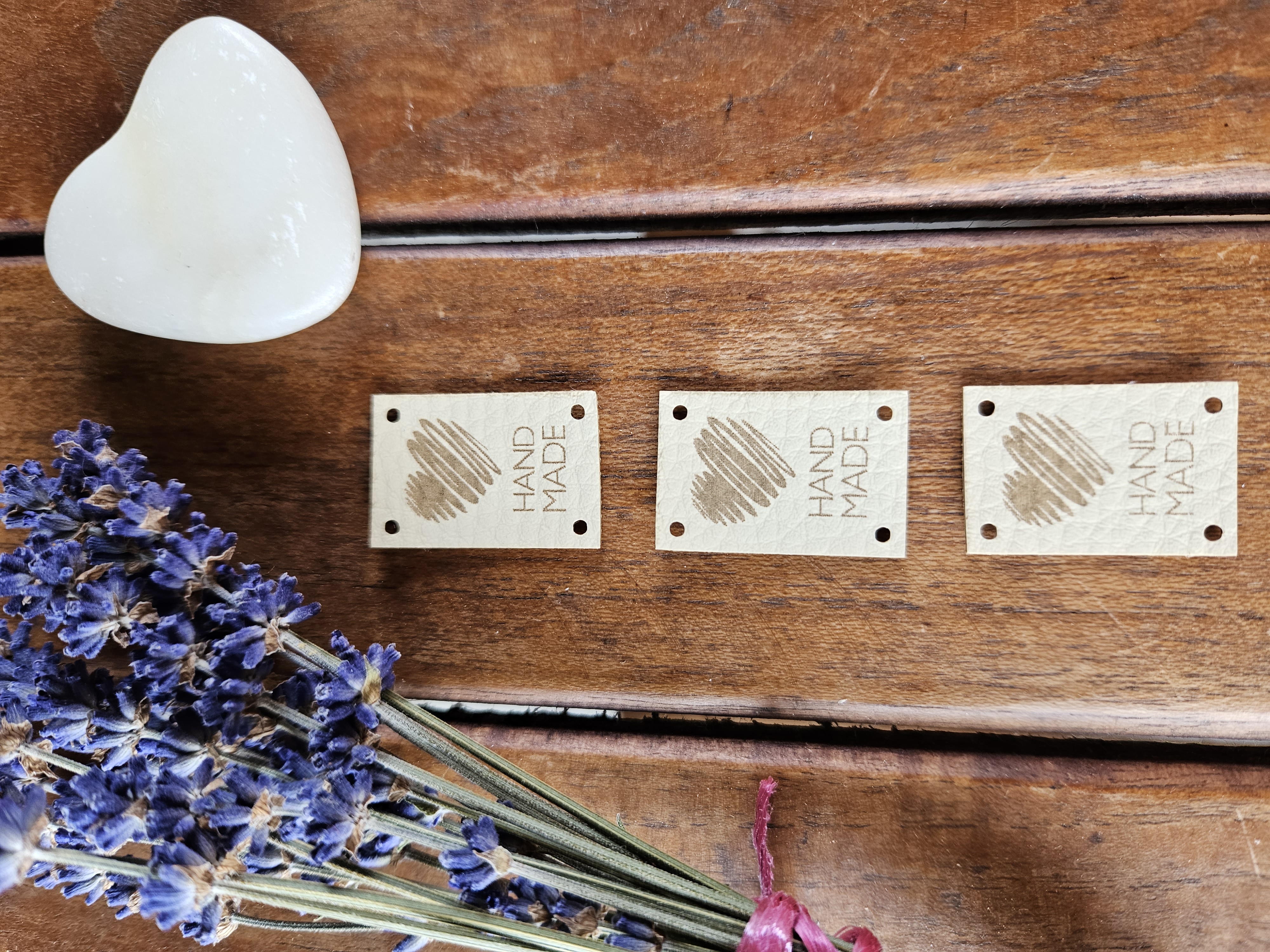 Etiketa z ekokůže s nápisem "HAND MADE" a náčrtem srdce. Etiketa má 4 otvory pro přišití.