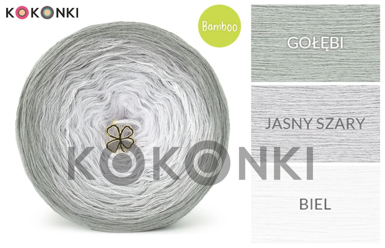 KOKONKI Bamboo je extrémně měkká, jemná, vzdušná a prodyšná příze. Kombinace bavlny a bambusu tvoří dokonalé duo. Bavlna s bambusem snadno schne, v horkých dnech ochlazuje tělo, nezpůsobuje alergie, má antibakteriální vlastnosti a dokonce blokuje UV paprsky. KOKONKI Bamboo je na léto perfektní volba - jak na šátky a šálky, tak i na letní kousky oblečení.
