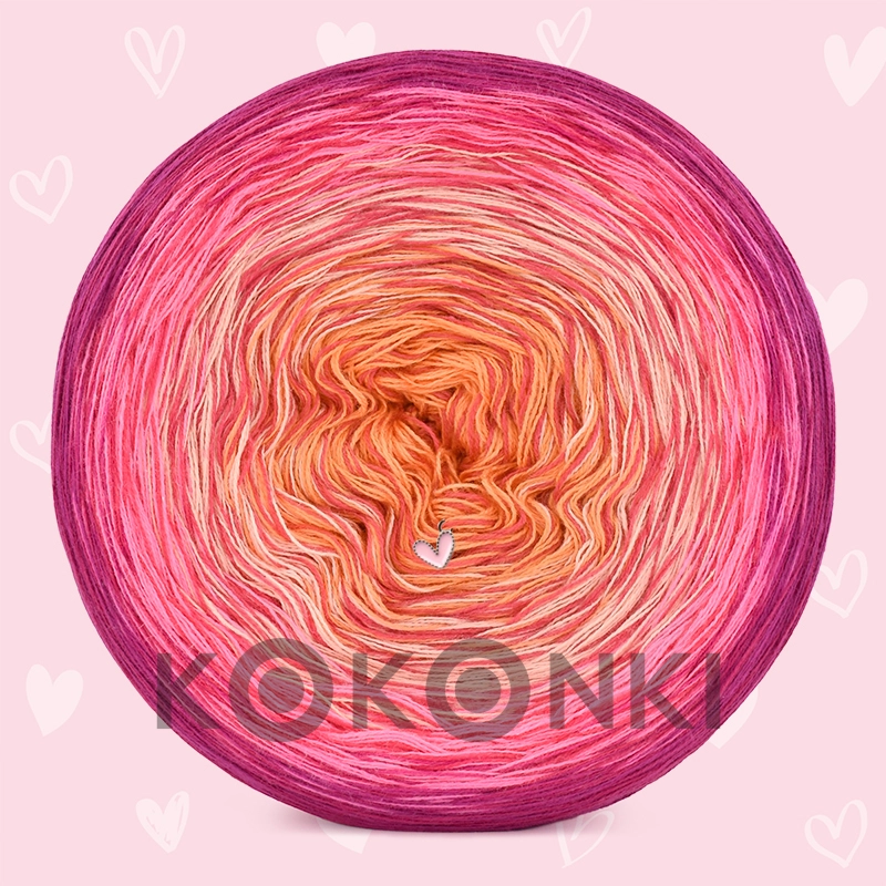 Ručně navinuté klubíčko s návinem 1.200 metrů váží 240 g. Dlouhé barevné přechody s efektem ombre. Nitky nejsou svinuté.